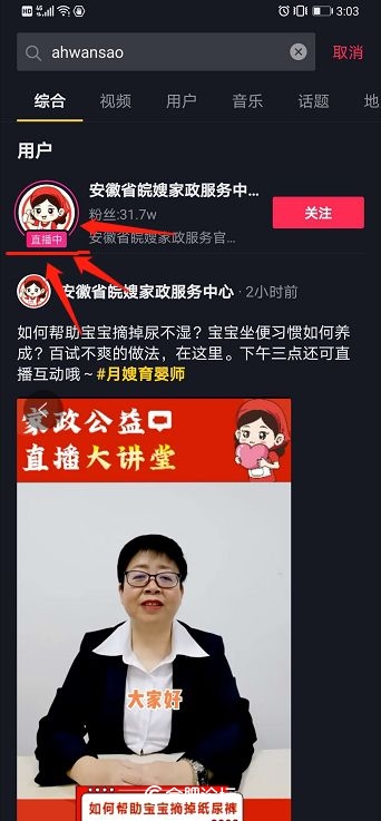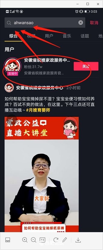 3.输入“ahwansao”-点击并关注“安徽省皖嫂家政服务中心”抖音号即可。