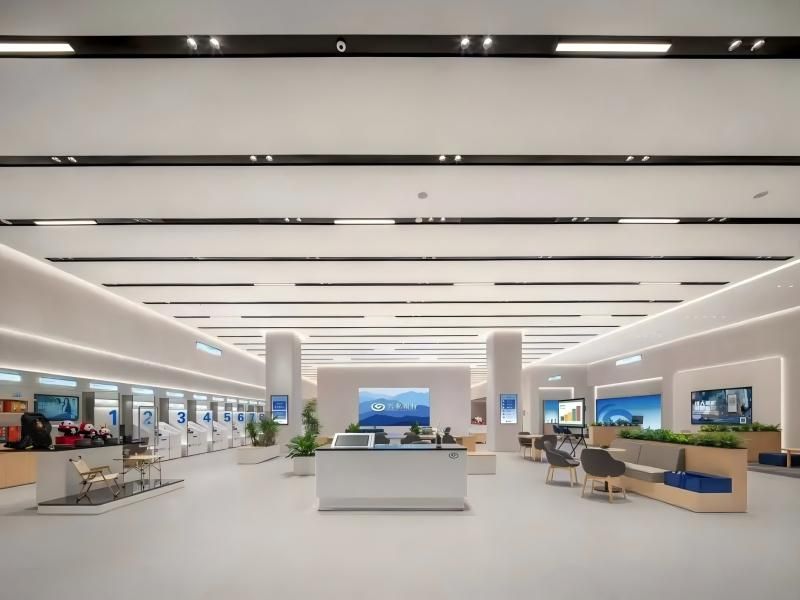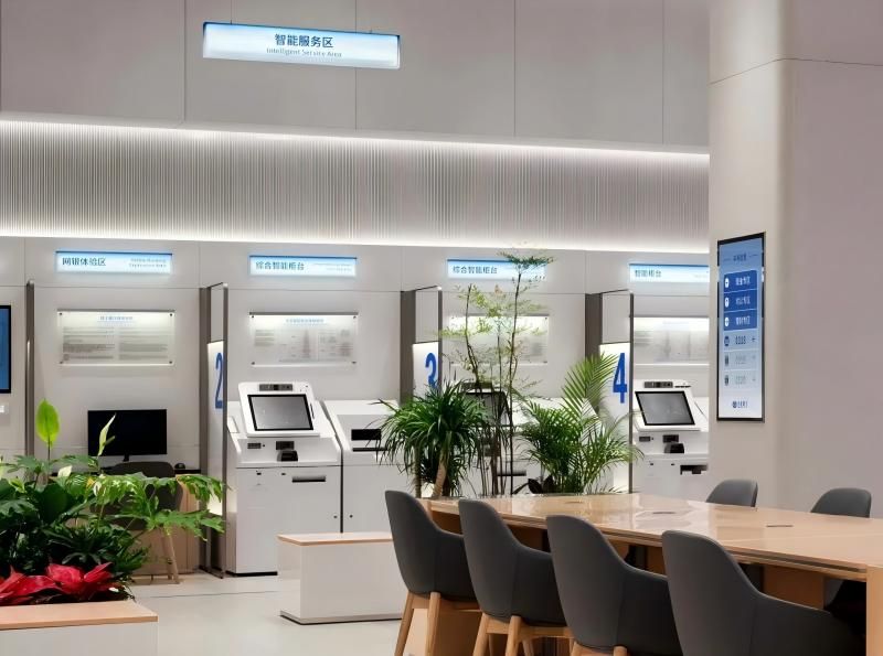 蓝白相映的电子门楣取代传统灯箱,美观又环保,让兴业银行践行ESG理念看得见、摸得着。玻璃材质的外立面设计,构造橱窗式通透空间,有效增加网点厅堂与街市风景的视觉互动。走进网点大门,白、灰、原木色装潢映入眼帘,自然融合的色调营造了简约温馨的氛围,让金融消费者宾至如归。厅堂里恰到好处的绿植点缀,赋予空间盎然生机,令人心情愉悦。同时,网点里随处可见的品牌蓝、环保绿相互辉映,大屏幕上跃动的“兴福龙”IP,以俏皮之姿增添网点活力与趣味,吸引了众多客户的目光。