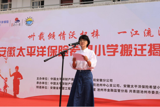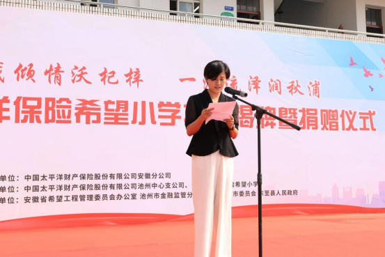 杨艳代表东至县委、县政府讲话,她表示,多年来,太平洋保险安徽分公司始终心系学校发展和孩子成长,从支教帮扶到助力学校合并搬迁优化办学环境,用实际行动诠释企业的社会责任,并在新学期到来之际对同学们表达了美好愿望。