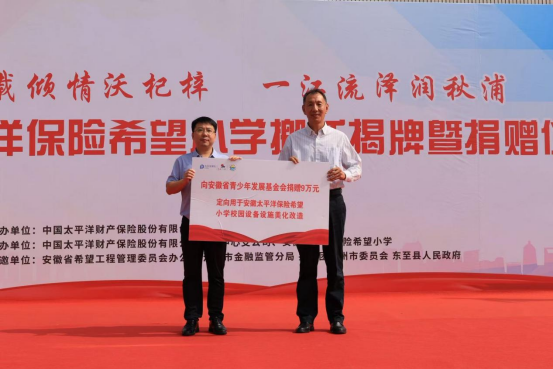 太平洋保险安徽分公司在致力发展自身的同时,积极投身公益、履行社会责任。 根据捐方意愿,该笔爱心捐款将定向用于安徽太平洋保险希望小学校园设备设施美化改造项目。
