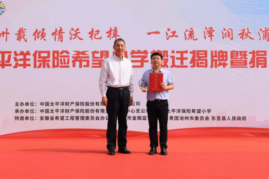 9月19日,太平洋产险安徽分公司与安徽省青少年发展基金会一行赴我省东至县大渡口镇安全小学开展安徽太平洋保险希望小学搬迁揭幕暨爱心捐赠仪式。安徽省政协委员、太平洋产险安徽分公司党委书记、总经理魏志山,国家金融监督管理总局池州分局党委委员、副局长张月,共青团池州市委副书记吴瑶,东至县人民政府副县长杨艳,太平洋产险安徽分公司党委委员、副总经理王磊,太平洋产险池州中心支公司党总支书记、总经理彭有结,东至县教育局局长刘敏,共青团东至县委书记陈志雄,太平洋产险安庆中心支公司党委书记、总经理王庆丰,安徽省青少年发展基金会秘书长、安徽省希望工程管理委员会办公室主任李永军,安徽省青少年发展基金会副秘书长章旻及大渡口镇相关领导出席活动。