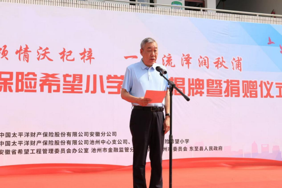魏志山在致词中表示:支持教育事业发展,是太平洋保险安徽分公司义不容辞的社会责任,将继续秉持责任、智慧、温度的太保服务理念,持续关注和支持开展安徽太平洋保险希望小学的教育事业,及其他社会公益事业,积极回馈社会,传递保险大爱。