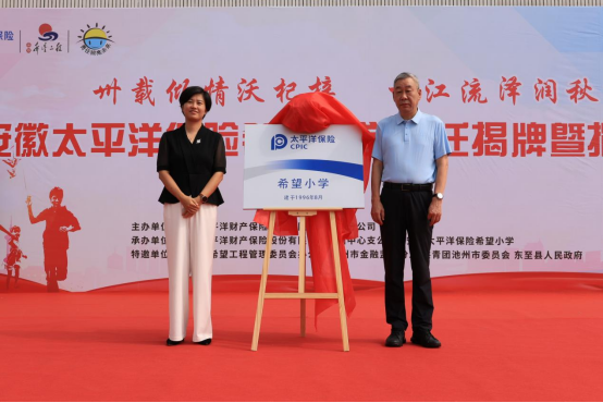 魏志山与杨艳共同为安徽太平洋保险希望小学揭牌。