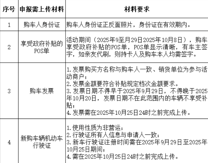 3.购车发票(发票开具时间需在2025年9月29日至2025年10月20日期间);