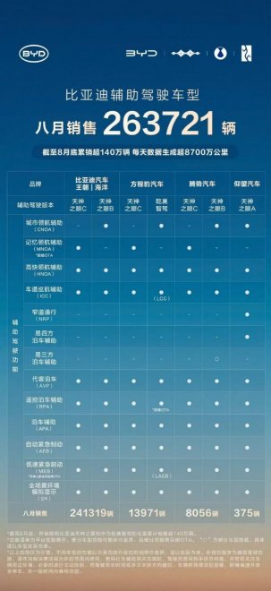 原标题:比亚迪1-8月销量超286万稳居榜首,天神之眼车型累计销量超140万辆