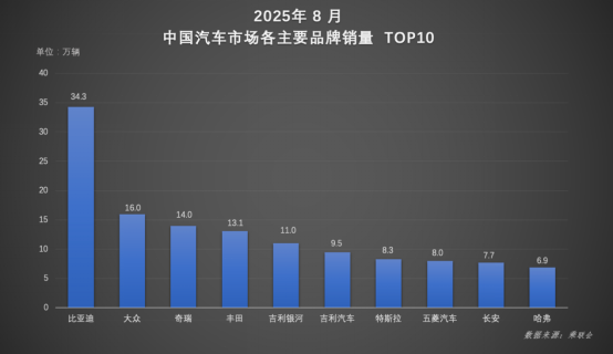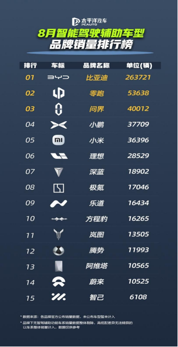 在太平洋汽车发布的8月智能驾驶辅助车型品牌销量榜中,比亚迪以26.37万辆一骑绝尘,其销量相当于第2至第10名品牌之和。