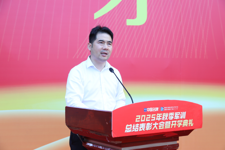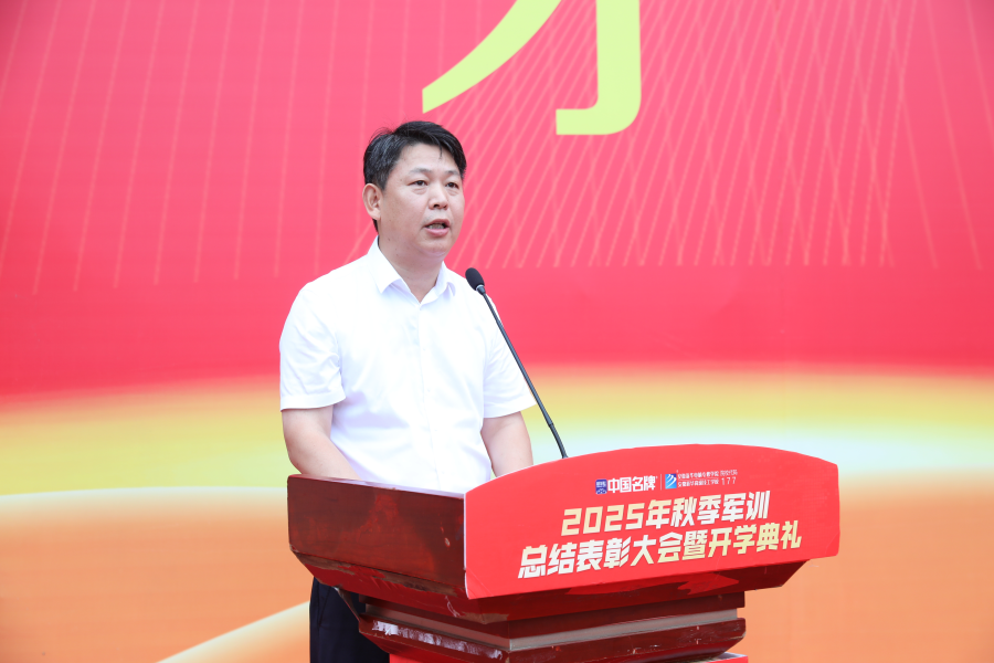 表彰环节后,副校长王俊作军训总结讲话。他充分肯定了本次军训的成果,对承训教官的辛勤付出和新生们的顽强拼搏表示衷心感谢与高度赞扬,并鼓励同学们将军训中养成的优良作风带入今后的学习生活中。