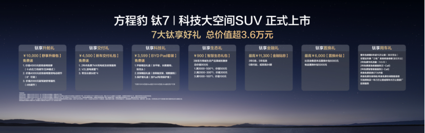 在购车权益上,方程豹更是诚意十足,为首批车主带来了总价值最高超3.6万元的7大钛享好礼!其中包括:覆盖多项座椅舒适配置的总价值10000元舒享升级包、价值3599元的BYD Pad套装、价值4500元的新车交付礼包均免费送;提供3年0息、5年低息、0首付起或至高84期等多重金融方案以供选择,金融贴息最高价值11300元;还有最高价值6000元的置换补贴、价值900元的智慧生态礼包,以及2年5G每个月的免费车机流量、非营运车辆长达6年或15万公里的整车包修、“三电”系统的终身保修、终身免费系统OTA升级等,让每一个家庭都能轻松拥抱钛7,让美好生活触手可及。