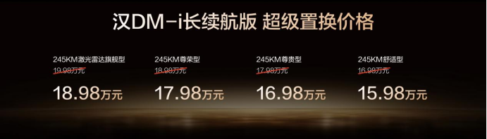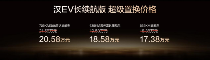 此次,汉DM-i长续航版共推出4款车型,补贴后售价15.98万~18.98万元;汉EV长续航版共推出3款车型,补贴后售价17.38万~20.58万元(10月31日前完成购车可享1万元超级置换补贴)。同时,比亚迪还为用户准备了包含置换补贴在内的至高价值3.8万元七大礼遇。