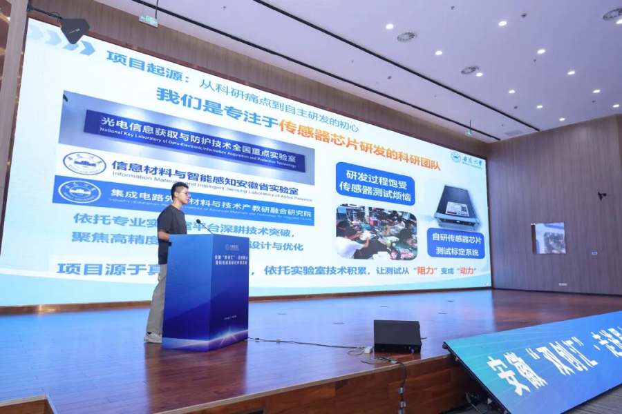 高校项目路演环节同样亮点纷呈。安徽大学郭小辉教授团队带来的“传感器芯片一站式测试平台”刚亮相,就吸引了不少企业代表的目光。“当前国产传感器测试标定系统存在硬件平台信号传输效率低、软件平台自动化程度不足问题,我们的平台正好解决这两个痛点。”郭小辉介绍,目前平台已经完成小试阶段,性能稳定可靠,已与一家研发传感器芯片的科研机构达成合作意向,将为4万枚传感器提供检测服务。